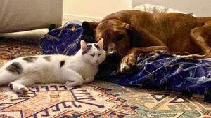 E’ stata durissima, eppure ce l’avete fatta tutti, forse (ci piace crederlo) anche un po’ grazie alle nostre preghiere, al nostro affetto e ai nostri pensieri positivi tutti per voi. Certamente grazie alla non comune tenacia e alla generosità del vostro custode ed amico, che vi ha condotti tutti in salvo consegnando ognuno di voi in mani amorevoli che, si spera, vi avranno ripagato almeno in parte di tutto quanto subito. Temo che tu non debba esserti fatto una grande opinione della nostra specie, ma forse questi anni quieti che hai potuto vivere serenamente insieme a Riccarda e a Marco hanno cambiato almeno un poco il tuo modo di vedere gli umani … Io questo lo spero. Di sicuro nonostante il male subito, il tuo immenso cuore di cane non ha perso la voglia di ricominciare, non ha esaurito la fiducia nell’uomo né la capacità di amore. Hai perfino scelto un incredibile nuovo compagno di vita: un gatto! Non il gatto di casa, ma un gatto randagio che è arrivato dopo di te, di sua spontanea iniziativa, un trovatello adottato …proprio da te! Chi avrebbe mai pensato che lo avresti accolto e addirittura protetto?! Oggi non ci sei più, ma quando vedo le tue foto, quando ripenso a te, ancora mi emoziono. E il mio cuore è leggero e grato al pensiero che hai potuto conoscere un riscatto, amore e sicurezza e che hai vissuto anni sereni, sotto lo sguardo vigile e premuroso di Riccarda, così piena di altruismo e dedizione. Ammiro te e ognuno dei nostri cani, sempre pronti a dare e a dimenticare, incapaci di serbare rancore verso noi uomini, che pure lo meriteremmo.